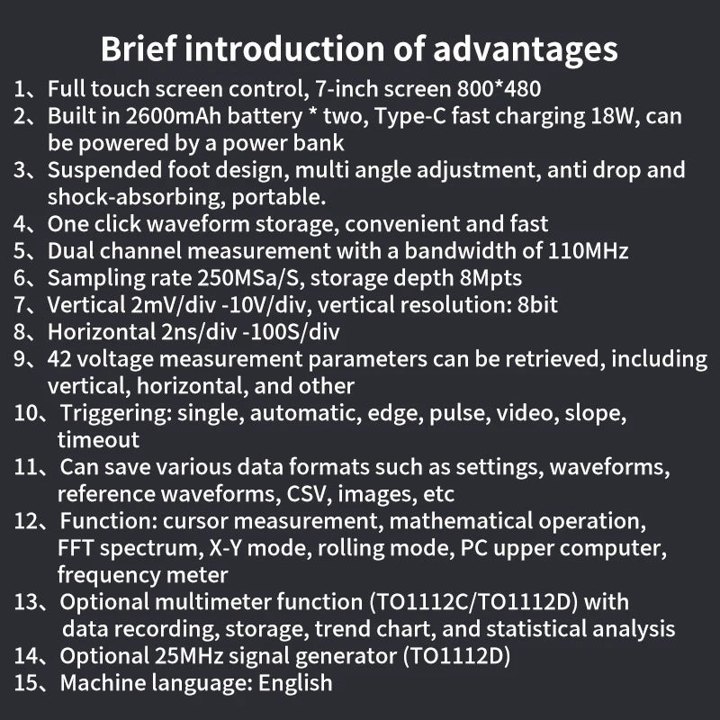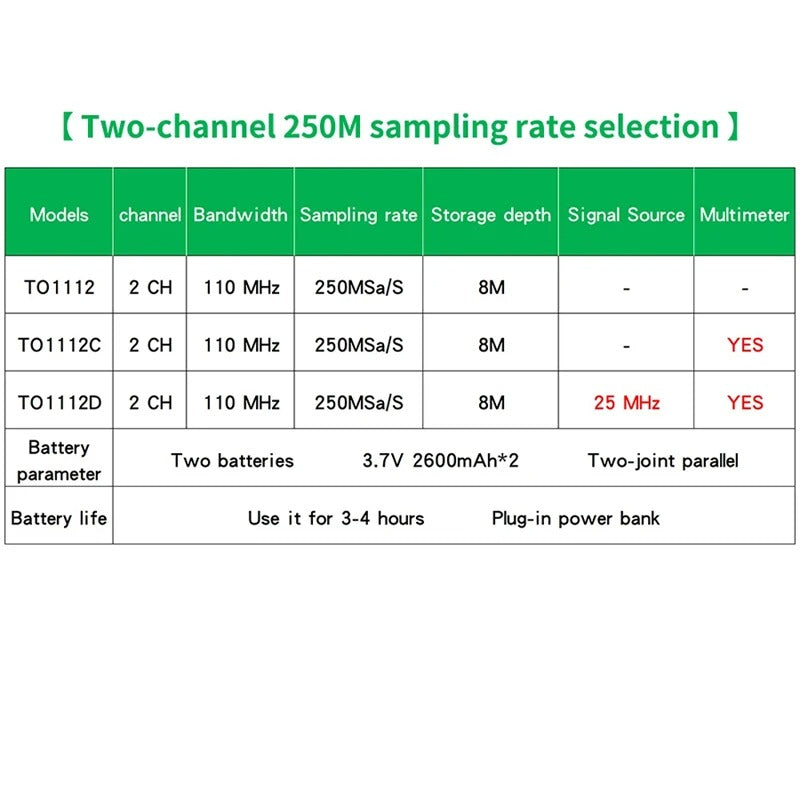 - TO1112D: Oscilloscope + multimeter + 25MHz signal source for R&D/advanced testing.