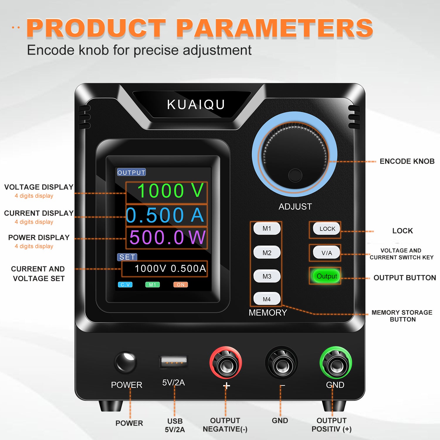 • Delivers a wide, continuously adjustable output range of 0-1000V voltage and 0-0.5A current, meeting the demands of high-voltage testing and precision applications.
