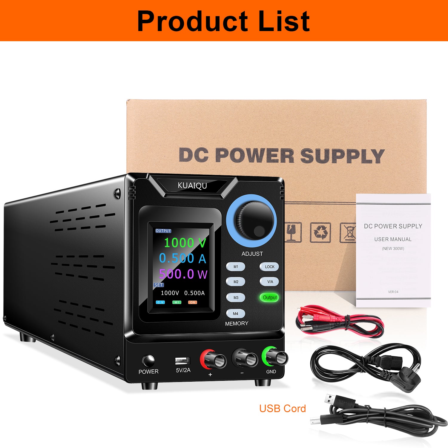 • Package includes: DC Power Supply *1, Output Power Cord *1, Input Power Cord *1, User Manual *1, Warranty Card *1.